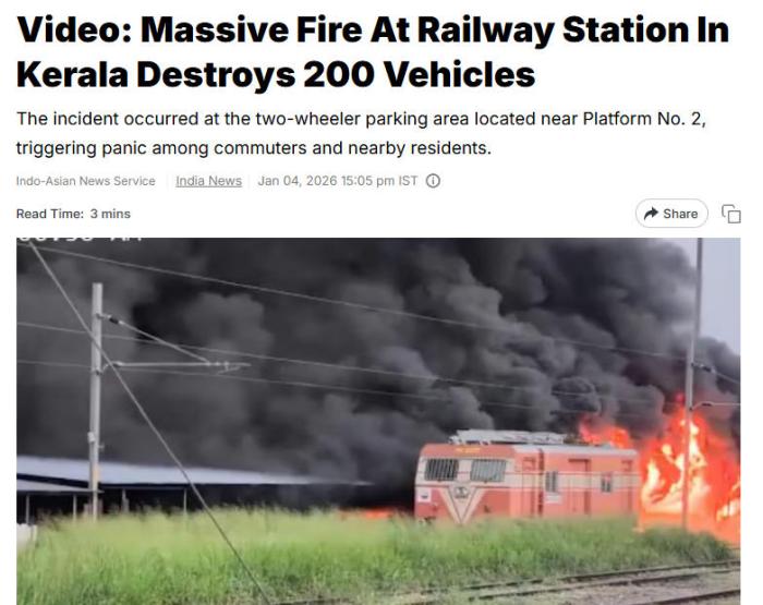 中新网1月6日电 据印度新德里电视台(NDTV)报道,日前,印度特里苏尔火车站(Thrissur)发生重大火灾,导致车站附近停车场的多辆车辆遭烧毁。