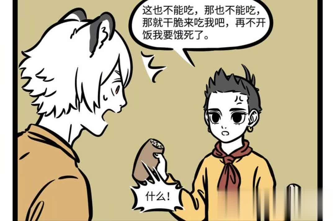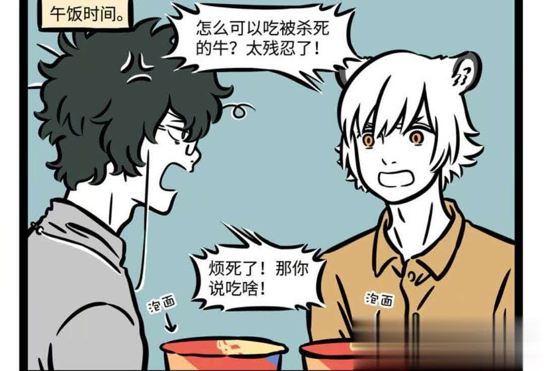 这不,白泽带着新室友驺虞吃午饭,吃的是泡面,结果驺虞便嚷嚷着说,怎么可以吃掉被杀死的牛。这下小菌懂了,原来泡面是红烧牛肉面。只不过小菌也很是无语,这泡面都不能吃。不过按驺虞的逻辑也没毛病,我们咋知道里面的蔬菜包与肉粒,一般都不是自然死亡的。就是不知道,不加蔬菜包与肉粒的泡面驺虞能不能接受,不然白泽估计连干脆面都吃不了了。这下白泽被驺虞逼急了,反问驺虞午饭吃啥。